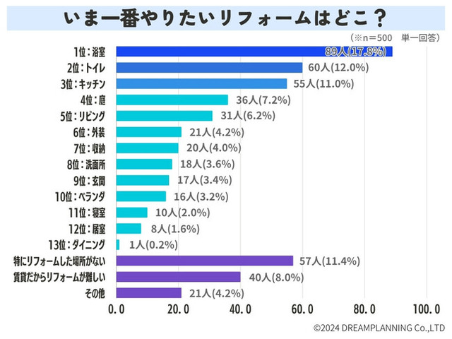 いま一番やりたいリフォームはどこ? (n=500 単一回答)