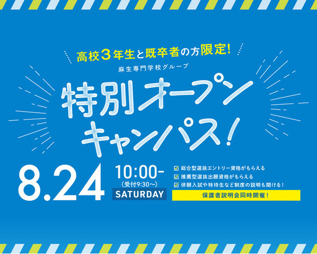 九州最大級の専門学校グループ 学校法人麻生塾/麻生専門学校グループ(理事長:麻生健)は、高校3年生・既卒者限定の特別オープンキャンパスを開催いたします。