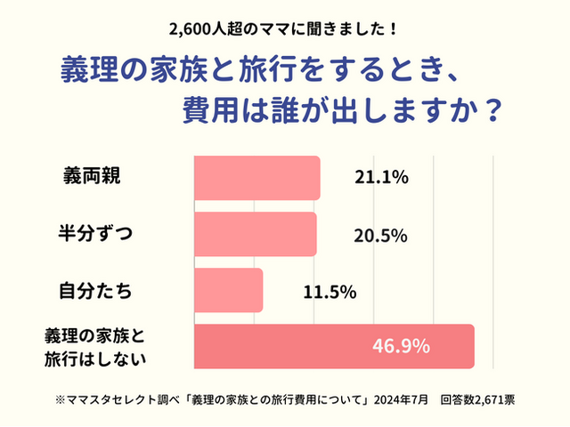 長期休みなどでは、義理の家族との旅行の機会も増えるでしょう。そんなとき、旅行費用は「自分たち(子ども世帯)」か「義家族」か、どちらが負担するのが一般的か。そのような疑問から、ママスタセレクトでは「義家族と旅行をするとき、費用は誰が出しますか?」というアンケートを実施しました。選択肢には「義両親」「自分たち」「半分ずつ」「義理の家族と旅行はしない」の4つを設定。2,600人を超えるママたちが回答を寄せてくれました。