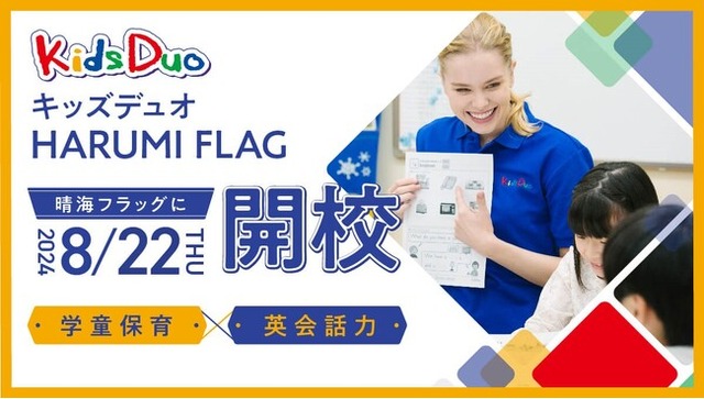 暮らしに必要なものがすべて揃うALL IN TOWN!と呼ばれるHARUMI FLAGに、やる気スイッチグループの英語学童、Kids Duoがオープンします。ネイティブ講師とバイリンガル講師のもと、長時間生きた英語を学ぶことができます。