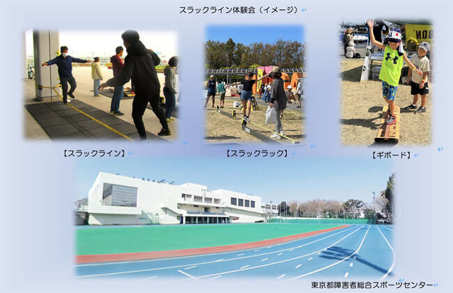 第3回は、小さなお子様から大人まで、障害の有無にかかわらずどなたでもお楽しみいただけるスラックラインの体験会を、9月15日(日)に東京都障害者総合スポーツセンター(北区)で行われる「スポーツ祭」にて開催します。