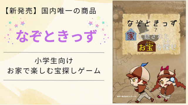 株式会社ユズレイカは国内唯一※1となる、小学生向けのお家で楽しめる宝探しキット【なぞときっず】を2024年8月1日より販売開始いたしました。
