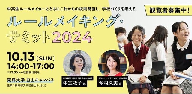 本イベントは、全国で校則見直しやルールメイキングに取り組む中高生100名が東京に集い、地域や学年を超えたルールメイキングの仲間と出会い、社会で活躍するルールメイカーと対話をしながら学びを深めるイベントです。2024年8月16日(金)より一般観覧の募集を開始する他、報道関係者へ公開することとなりましたのでお知らせします。