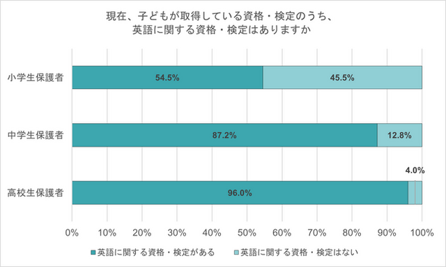 英語に関する資格以外は取得していないという回答も、小学生保護者12.6%、中学生保護者17.3%、高校生保護者17.4%だった。