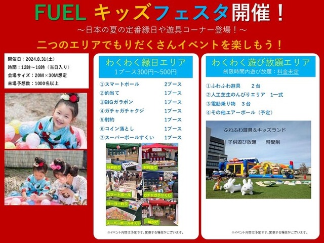 今年で3回目の世界最大級のカーフェス「FUELFEST JAPAN 2024 」では、夏休み最後にお子様と一緒に楽しんでいただける「FUELキッズ・フェスタ」を同時開催。 ★日本の夏では定番の縁日エリア「わくわく縁日エリア」1.スマートボール2.的当て3.BIGガラポン⓸ガチャガチャくじ5.射的6.コイン落とし7.スーパーボールすくい ★遊具コーナー「わくわく遊び放題エリア」1.ふわふわ遊具2.人工芝生のんびりエリア3.電動乗り物⓸その他エアーボール(予定) ★HINO TEAM SUGAWARA & Brother Presents 「ダカールラリーチャレンジ」1.大きなすごろくチャレンジコーナー(参加されたご家族にはもれなく参加賞もプレゼント) など、盛り沢山のエリアをお楽しみいただけます。※イベント内容は予定です、内容が変更する場合もございます。