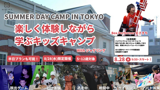 東京都渋谷区広尾を本拠地とする株式会社MAGMAは、2024年8月21日(水)に5歳~12歳を対象とした「SUMMER DAY CAMP」内でBox Performer まさきちさんを迎え、都内広尾にてコラボ開催します。体を動かす戦闘ゲームや逃走ゲームからクラフト工房、サイエンス教室、フード作りなど1日に7つのアクティビティを体験しつつ、ジャグリング体験もできたりと非日常体験を。子どもたちはワクワク楽しい一日で、普段なかなか学ぶことのできないコミュニケーション能力や勇気、自信、そして探究を育みます。