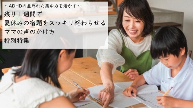 そこでこの度、宿題が先延ばしになっているADHDタイプのお子さんや、心配しているママに向けて『残り1週間で夏休みの宿題をスッキリ終わらせるママの声のかけ方特集』を組み本日よりWebサイトにて公開いたしました。