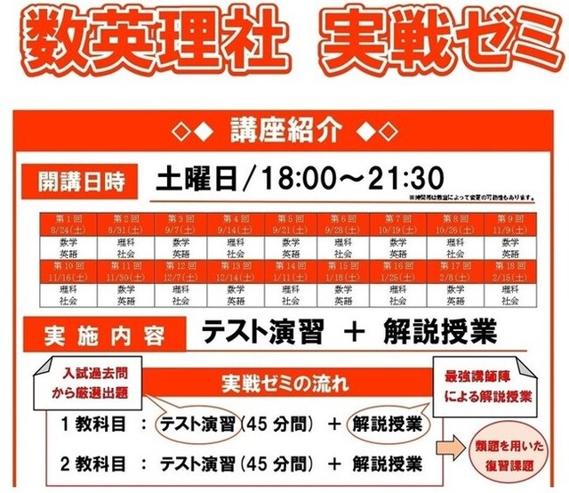 数学、英語、理科、社会のそれぞれでテスト演習と解説授業を行います。宮城県の実際の入試では各教科50分で実施されますが、実戦ゼミでは45分間のテスト時間とすることで、より素早く問題を解く力を鍛えていきます。