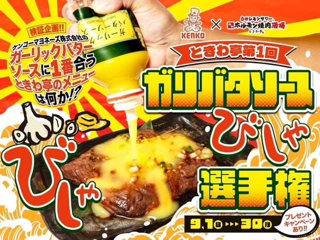 ケンコーマヨネーズ株式会社(本社:東京都杉並区、代表取締役社長:島本 国一、以下「当社」)は、GOSSO株式会社(本社:東京都渋谷区、代表取締役:藤田 建)が展開する「0秒レモンサワー(R)仙台ホルモン焼肉酒場 ときわ亭(以下「ときわ亭」)」と、当社の人気商品『ガーリックバターソース』を使ったコラボレーション企画を実施いたします。