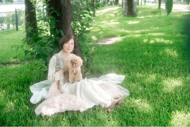 大好きなペットと、お気に入りの公園で自然な笑顔を撮影。衣裳は最新のハイブランドをスタイリストがセレクト。