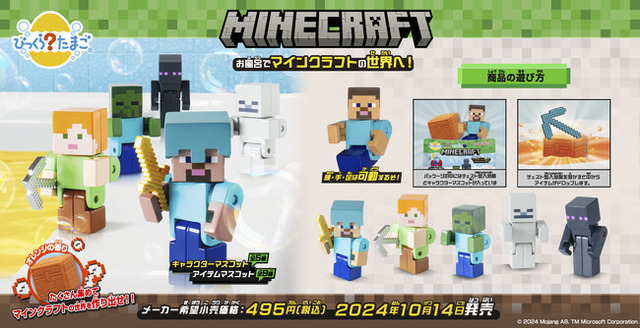 株式会社バンダイ ライフスタイル事業部は、累計出荷数2億300万個(2024年3月時点)を突破したマスコット入り入浴剤「びっくらたまご」シリーズから、全世界で大人気のゲーム『MINECRAFT(マインクラフト)』に登場するキャラクターフィギュアとアイテム入りのチェスト型入浴剤がセットになった商品、「びっくらたまご MINECRAFT」(495円 税込)を2024年10月14日(月)より順次、全国の量販店・ドラッグストア・玩具店・家電量販店の日用品売場・玩具売場で販売開始いたします。(地域・お店により多少時期が異なります。)
