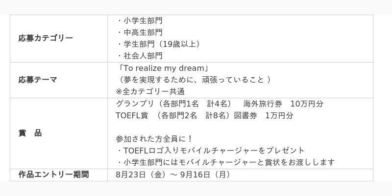 「海外で実現したいことがある」「英語を活用して新たな挑戦をしてみたい」「将来海外で活躍できる人になりたい」そんなみなさんの想いを応援する「Speakingチャレンジ動画コンテスト」を今年も開催いたします。今年は『夢を実現するために、頑張っていること』を60秒以内で自由に英語で語ってください。入賞者の方には10万円分の海外旅行券や1万円分の図書券をご用意。さらに今年は参加いただいた方全員に、TOEFLロゴ入りモバイルチャージャーをプレゼントします。
