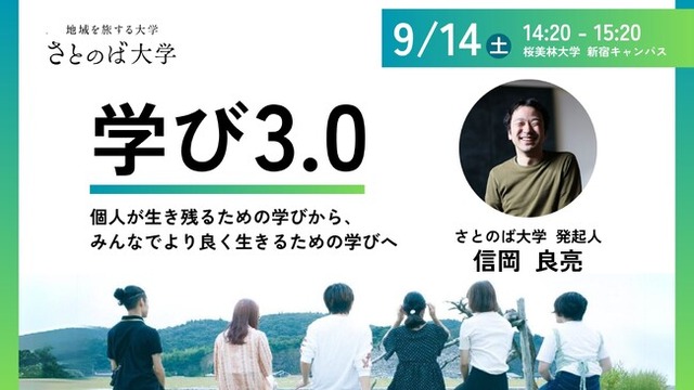 今年4月に発刊したさとのば大学初の書籍のタイトルでもある「学び3.0」をテーマに、“生きる”と“学ぶ”の境界線をなくす新しい学びのスタイルを「学び3.0」というコンセプトで整理し、「自分は、学びによって変わることができる。みんなで共に学ぶことで、未来は自分たちの手で創っていくことができる。」と思える未来の教育について、“プロジェクト・センタード・アプローチ”型の「さとのば大学」の実践を例に、みなさんと共に考えます。