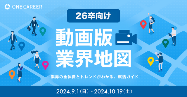 はじめてのキャリアを選ぶ、就活サイト「ONE CAREER」を運営する株式会社ワンキャリア(本社:東京都渋谷区、代表取締役社長 執行役員CEO:宮下 尚之、以下ワンキャリア)は、就活生人気が高い業界のリーディングカンパニーの人事担当者や有識者が登場し、業界の理解を深められるオンラインイベント「動画版業界地図」を9月1日(日)から10月19日(土)まで開催します[※1]。