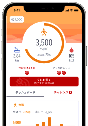 さらに1日5,000歩達成すると、翌日、高確率で当たる「くじ」でポイントゲット。