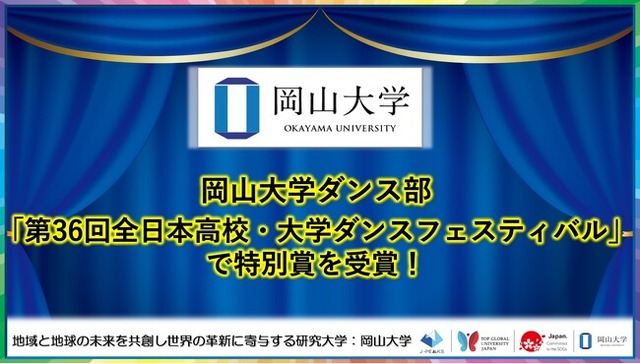 国立大学法人岡山大学(本部:岡山市北区、学長:那須保友)のダンス部は2024年8月7~10日、神戸市で開催された「第36回全日本高校・大学ダンスフェスティバル」で、上位10賞の一つである「特別賞 主題にふさわしい演出効果の工夫」を受賞しました。