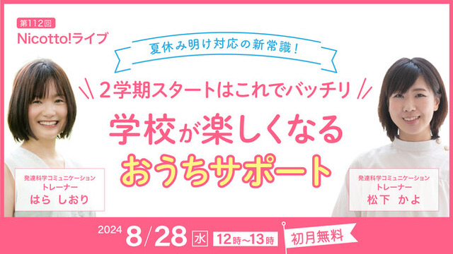 そこで、2024年8月28日にNicotto!塾で「夏休み明け対応の新常識!2学期スタートはこれでバッチリ学校が楽しくなるおうちサポート」をテーマにオンラインライブを開催します。