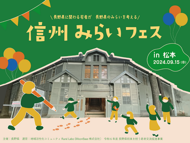 MoonBase株式会社(長野県上伊那郡辰野町/代表取締役:小菅勇太郎)が運営する地域活性化コミュニティ Rural Laboは、令和6年度 長野県将来を担う若者交流促進事業を受託し、長野県に関わる若者が集い、みらいについて考えるイベント「信州みらいフェス in 松本」を2024年9月15日(日)に、長野県松本市 あがたの森文化会館にて開催いたします。
