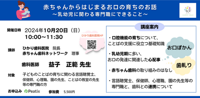 お口の育ちを切り口に、健やかな発達を応援するため、言語聴覚士や保健師、園の先生などの専門職ができることを学びます。