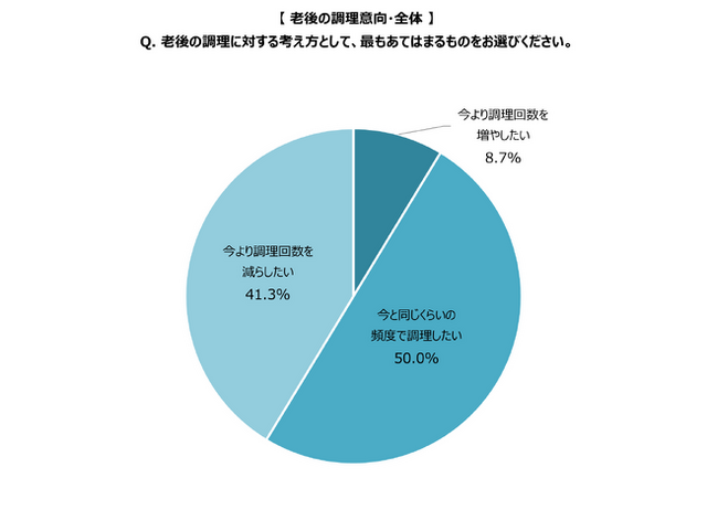 ・ 老後の調理頻度に関しては、「今より自分で調理する回数を減らしたい」が全体で41.3%、50歳以上では65%に。