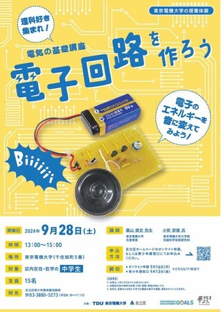 東京電機大学(学長 射場本忠彦)は9月28日(土)、東京千住キャンパスにて、足立区内の理科好きな中学生を対象とした体験型ワークショップ「理科好き集まれ! 電気の基礎講座 電子回路をろう」を開催します。本ワークショップは、足立区との地域連携イベントです。