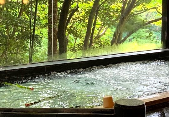 全面ガラス張りの浴室内部から、自然味あふれる木々を眺めながらの温泉をお楽しみください。