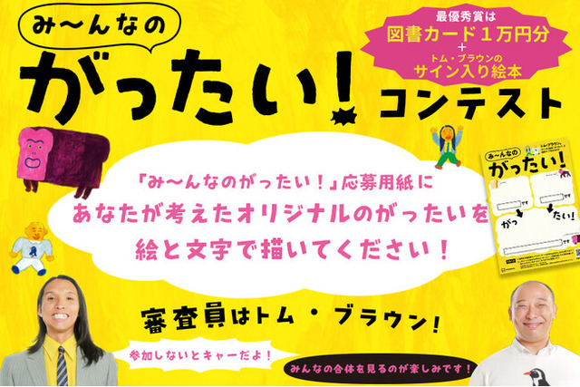 布川ひろきとみちおのお笑いコンビ、トム・ブラウンの初の絵本『がったい!』は、次々と生き物やモノをがったいさせて、不思議な生き物をうみだしていく絵本です。この絵本のように、さまざまなものを「がったい」するアイデアを大募集します! 最優秀賞の賞品は、トム・ブラウンのサイン入り絵本『がったい!』と1万円分の図書カードです。