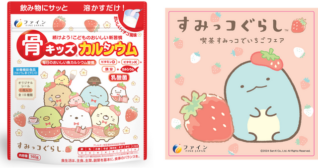 健康食品及び医薬品などを製造・販売する株式会社ファイン(本社:大阪市淀川区、代表取締役:佐々木 信綱)は、以前より毎日の栄養バランスを美味しくサポートする『骨キッズ(R)カルシウム』シリーズを販売しています。そしてこの度、大人気キャラクター“すみっコぐらし”仕様の『骨キッズ(R)カルシウム イチゴ風味』のパッケージをリニューアルし、令和6年8月20日(火)より全国のドラッグストア、自社ECサイトにて販売開始しました。