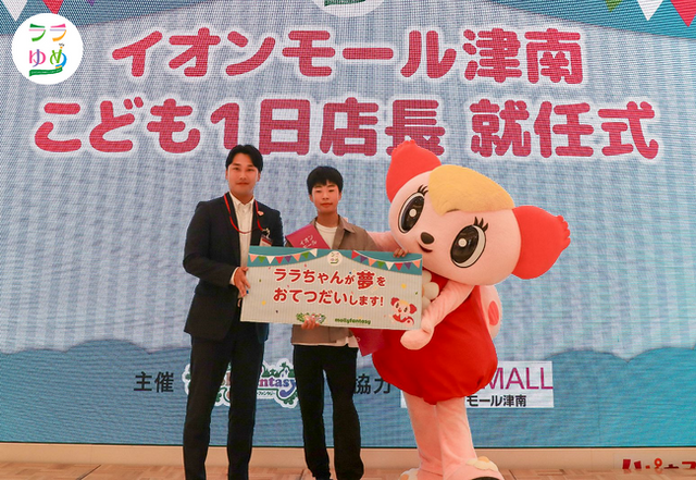 株式会社イオンファンタジー(代表取締役社長:藤原徳也、所在地:千葉県千葉市、以下、当社)は、モーリーファンタジーのキャラクター“ララちゃん”が夢を叶えるおてつだいをする企画 「ララゆめ ~ララちゃんが夢をおてつだいします!~」で2,677件の応募の中から選ばれた、三重県松阪市 こうたくん(12歳)の「イオンモールの1日店長になりたい。」という夢を8月22日(木)にイオンモール津南にご協力いただき叶えました。