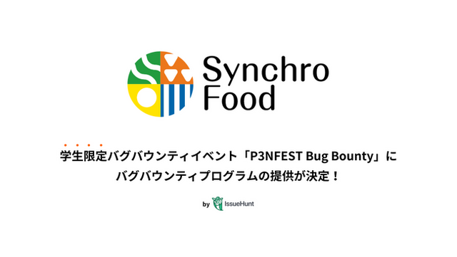 バグバウンティ・プラットフォームやプロダクトセキュリティ支援サービス等を提供するIssueHunt株式会社(本社:東京都中央区日本橋茅場町一丁目8番1号、代表取締役:横溝 一将、HP:https://issuehunt.jp )が開催する、学生向けバグバウンティイベント「P3NFEST Bug Bounty」について、シンクロ・フード様にご提供いただくバグバウンティプログラムが決定しましたので、お知らせいたします。
