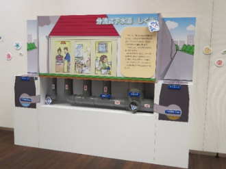 ●内容:下水道の仕組み・役割、浸水対策、市の下水道の歴史などの紹介、家庭内排水設備模型(写真上)、下水道クイズ、デザインマンホール蓋(実物)、および令和3年度実施の「マンホールふたデザインコンクール」優秀作品パネルほか。