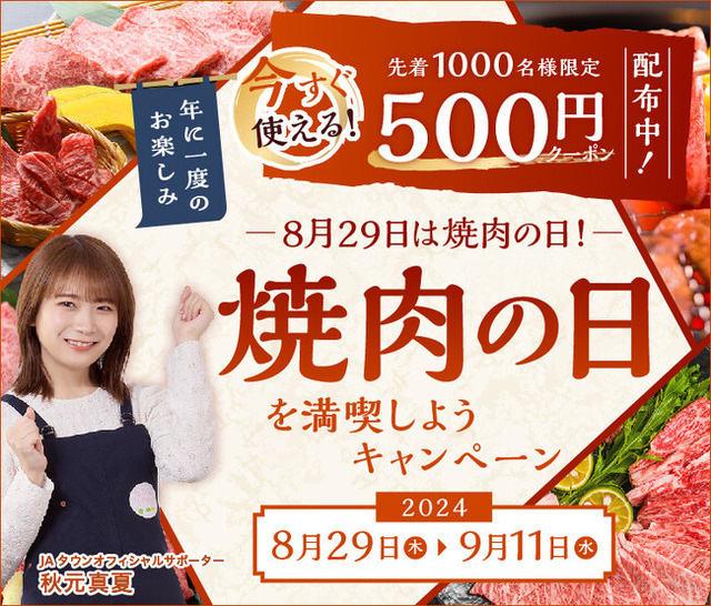 このキャンペーンは、8月29日“焼肉の日”に合わせて実施するもので、対象商品をご購入頂いた方の中から先着1,000名様に「今すぐ使える500円引きクーポン」をプレゼントします。