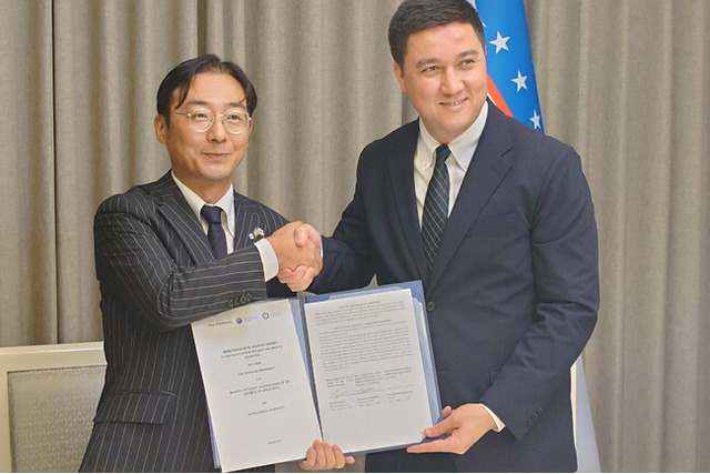 協定の締結をする本学 木村泰己 常務理事(左)とウズベキスタン共和国 ロスタム・カリムジョノフ副大臣(右)