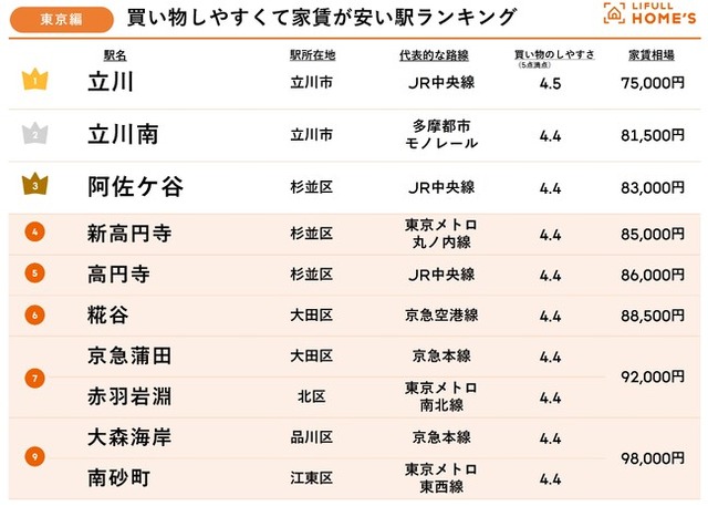「買い物しやすくて家賃が安い駅ランキング」東京編の1位は「立川駅」(75,000円)です。