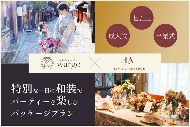 「日本の観光をリードし、文化を次世代につなぐ」というミッション・ビジョン実現のため、観光・インバウンド領域で多様なサービスを展開している株式会社羅針盤(本社:東京都中央区、代表取締役:佐々木文人)が運営するきものレンタル wargoは、七五三・成人式・卒業式など和装で迎える晴れの日を家族や友人とさらに特別な一日にしていただきたいと思い、株式会社JTBが運営する感動パーティープロデュースサービス『Living Auberge』と提携します。特別な「食事体験」を「日常空間」でお食事パーティーを提供する『Living Auberge』に、きものレンタル wargoの「和装」を組み込み衣食住を体現した特別なパッケージプランを共同で作成し、2024年8月29日(木)より開始します。
