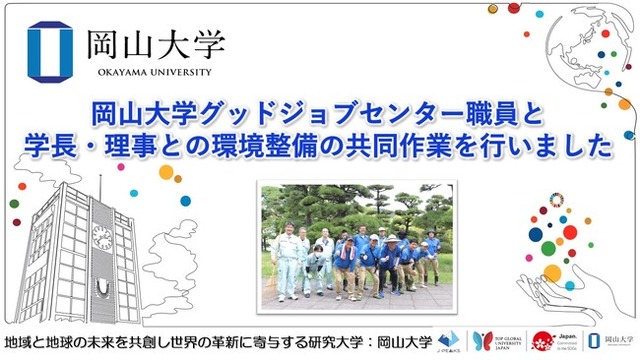 国立大学法人岡山大学(本部:岡山市北区、学長:那須保友)は、2024年 8月22日、那須保友学長、三村由香里理事(企画・評価・総務担当)および袖山禎之理事(財務・施設担当)・事務総長が、グッドジョブセンターの職員と環境整備の共同作業を行いました。