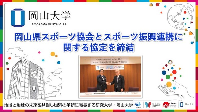 国立大学法人岡山大学(本部:岡山市北区、学長:那須保友)は、2024年8月23日、公益財団法人岡山県スポーツ協会とスポーツ振興連携に関する協定を本学津島キャンパスの本部棟で締結しました。この協定は本学のステークホルダーである岡山県民が、スポーツの力により、健康でいきいきと暮らせる社会の実現を目指すものです。