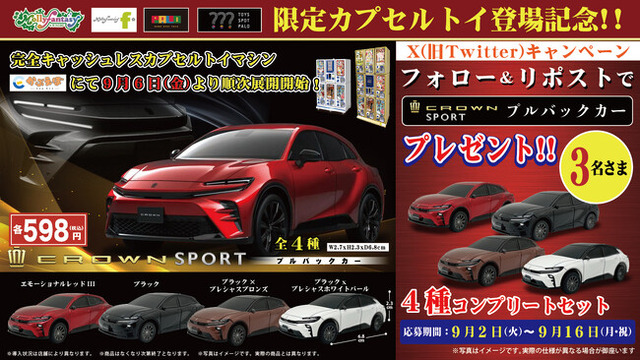株式会社イオンファンタジー(本社:千葉県千葉市、代表取締役社長:藤原徳也、以下、当社)は、当社施設にて展開する車ファンに人気の車種をモデルにしたプルバックカーシリーズ第5弾「トヨタ クラウンスポーツ プルバックカー」を、アミューズメント施設「モーリーファンタジー」「PALO」、カプセルトイ専門店「TOYS SPOT PALO」「カプセル横丁」などに設置する当社オリジナル完全キャッシュレスカプセルトイマシン「かぷえぼ」限定のカプセルトイとして9月6日(金)より順次展開いたします。
