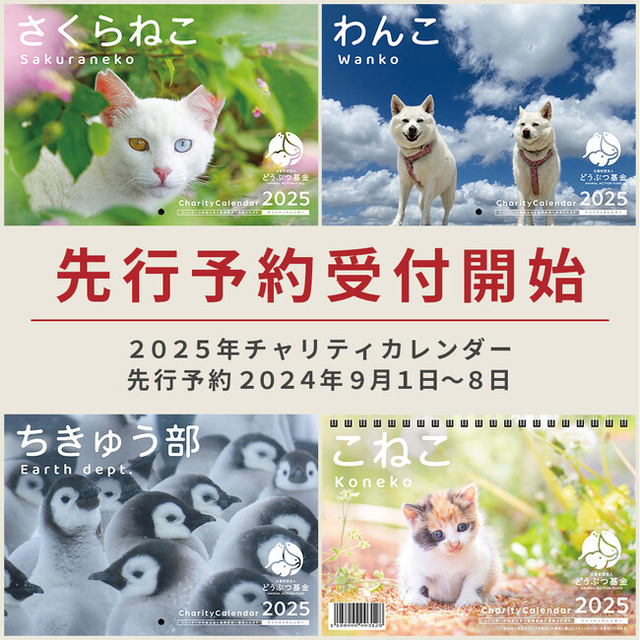 犬や猫の殺処分ゼロの実現を目指す公益財団法人どうぶつ基金(所在地:兵庫県芦屋市、理事長:佐上邦久)は、2025年チャリティカレンダーの先行予約受付を2024年9月1日より開始しました。チャリティカレンダーは、「さくらねこ」「わんこ」「こねこ卓上」「ちきゅう部」の4種類。チャリティカレンダーの売上はすべて動物愛護活動に使用されます。カレンダー購入でのご支援をお願いいたします。