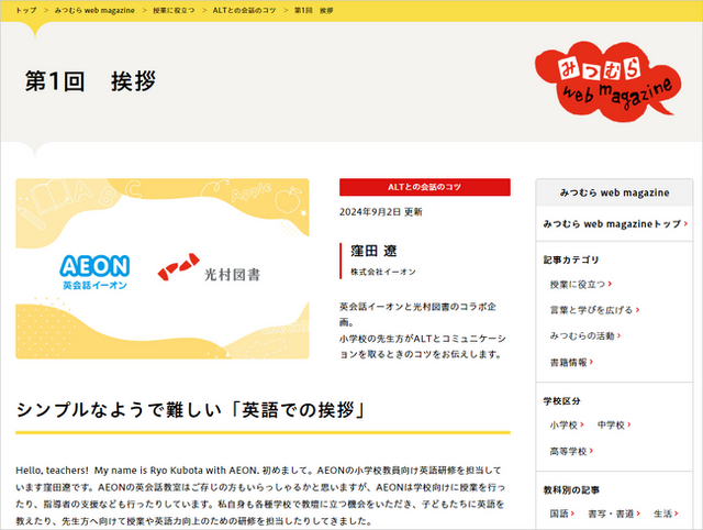 小・中・高等学校向けの教科書を発行する光村図書出版株式会社(所在地:東京都品川区、代表取締役社長:吉田直樹)は、株式会社イーオン(本社:東京都新宿区、代表取締役社長:重野 卓、以下 イーオン)とのコラボ企画コンテンツ「ALTとの会話のコツ」を9月2日にウェブサイトにて公開しました。