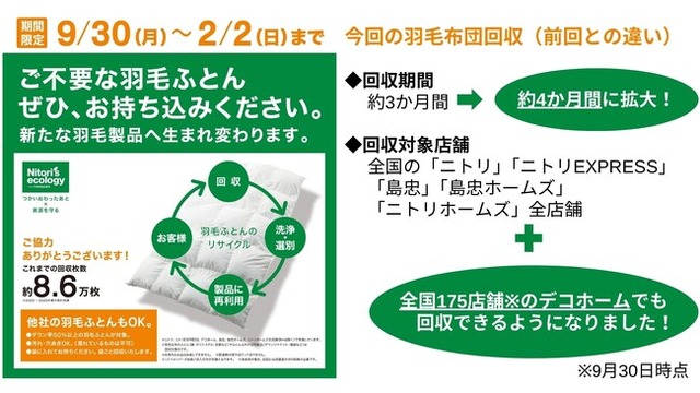 今年度は、「近くにニトリや島忠店舗がないので持ち込みづらい」というお客様の声にお応えし、主に駅ビルや各地ショッピングセンター内などに店舗を構える「デコホーム」全店(175店/9月30日時点)にも回収拠点を拡大。さらに昨年度よりも回収期間を約1か月間拡大し、9月30日(月)から年明け後2月2日(日)まで受付いたします。期間中は、ニトリポイントのプレゼントも。