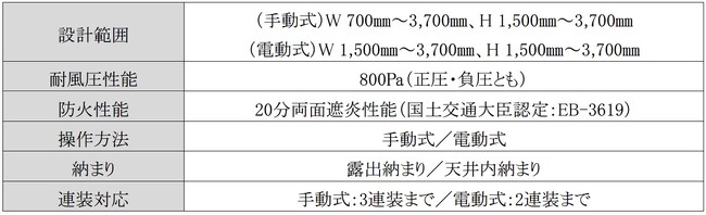 遮炎性能を有する防火設備として、国土交通大臣認定(認定番号:EB-3619)を取得。防火地域・準防火地域の建築物の外壁開口部に設置が可能で、手動式は3連装、電動式は2連装まで対応できますので、広い開口にもご使用いただけます。