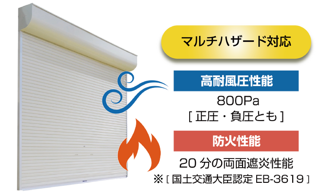 シャッターを閉鎖するだけで耐風圧性能800㎩(正圧・負圧とも)という高い耐風圧性能を発揮することに加え、防火性能も確保。シャッターひとつで強風や火災から室内の安全と大切な財産を守ります。