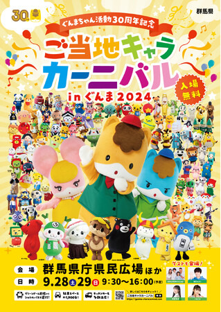 群馬県は、群馬県の宣伝部長ぐんまちゃんの活動30周年を記念して、「ご当地キャラカーニバル in ぐんま2024」を開催します。これまでぐんまちゃんの活動を応援してくださった全国各地のご当地キャラクターや県内外のみなさまへの感謝を込めて、企画・準備を進めています。