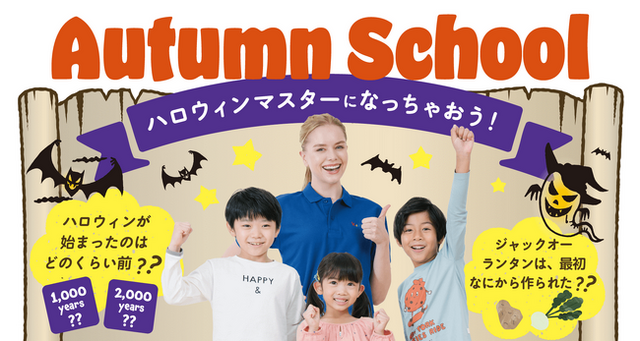 「オータムスクール」ではお子さまにみっちり4時間、英語浸けの環境でお過ごしいただきます。今年のテーマは「Happy Halloween」。このプログラムではハロウィンの起源や歴史を楽しみながら学んでいきます。