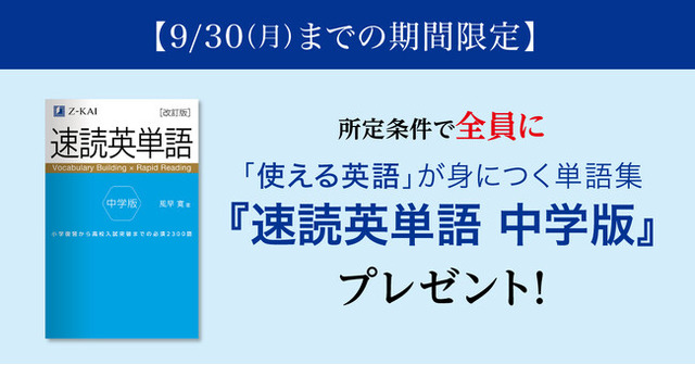 株式会社増進会ホールディングス(Z会グループ)のグループ会社である株式会社Z会は、「Z会の通信教育」中学生向けコースにおいて、中1~中3生を対象に、期間限定でZ会書籍『速読英単語 中学版[改訂版]』をプレゼントします。