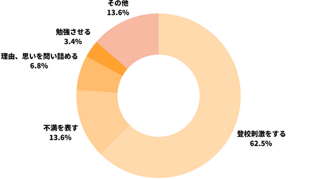 寄せられた88名の回答を種類別に分けてまとめました。結果は「登校刺激をする」が62.5%(55名)で、「不満を表す」が13.6%(12名)、「理由、思いを問い詰める」が6.8%(6名)、「勉強させる」が3.4%(3名)、「その他」が13.6%(12名)となりました。