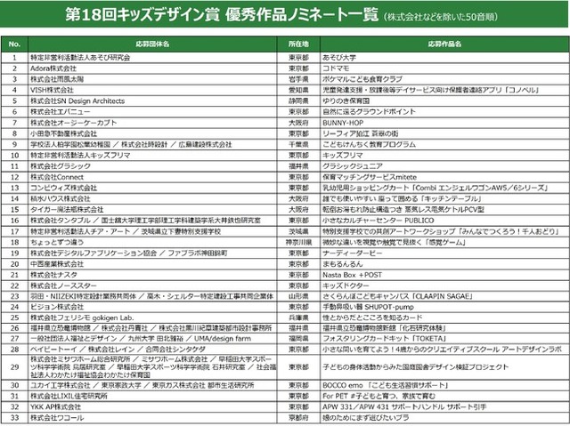 第18回キッズデザイン賞 優秀作品ノミネート一覧