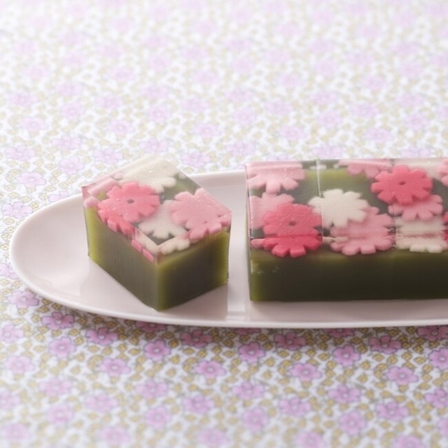 紅・黄・紫の鮮やかな色合いで、長寿を祝う菊を表した季節の羊羹です。