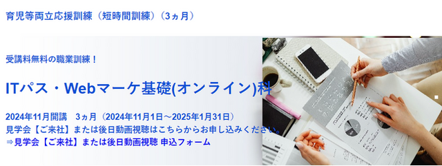 株式会社クリーク・アンド・リバー社(C&R社)は、東京都から委託された令和6年度育児等両立応援訓練(短時間訓練)において、「ITパス・Webマーケ基礎(オンライン)科」(11月開講)の受講生を募集します。